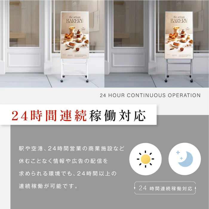 キャスター付きスタンドを標準搭載し、移動や収納が簡単。会議室や店舗での出し入れにも便利で、 壁付け・天吊りにも対応した薄型・軽量設計により、重量制限のある設置環境でもすっきりと設置が可能です。 Android 9.0 OSを搭載し、多様なコンテンツフォーマットに対応しています。