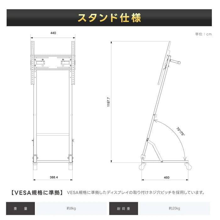 VESA規格に準拠したネジ穴ピッチを採用し、200×200mm~400×400mmの幅広いサイズに対応。 70°~75°の角度調整が可能で、自然な視線でディスプレイを視認できる設計です。 ロック機能付きキャスターを搭載し、移動や収納が簡単で、会議室や店舗での出し入れにも便利です。
