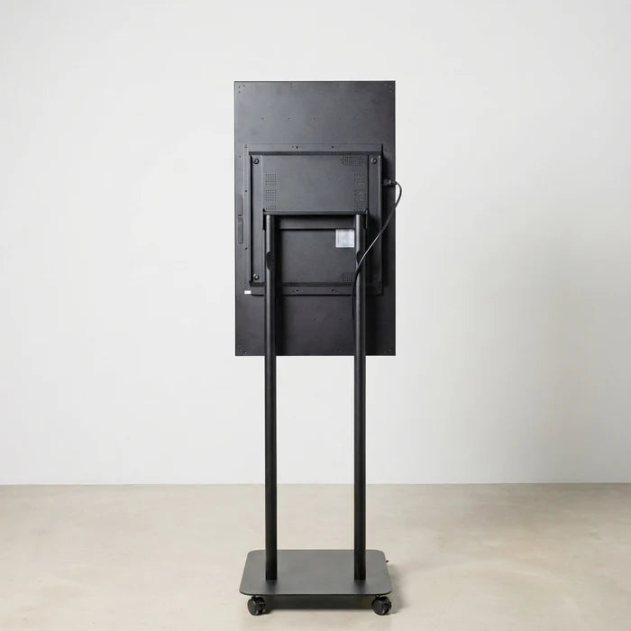 縦表示・横表示の両方に対応しており、設置環境に応じて柔軟にレイアウト可能。 さらに画面の角度調整も行えるため、視認性の高い設置が可能です。 キャスター付きの2本ポールスタンド仕様で、移動や設置変更にも便利です。