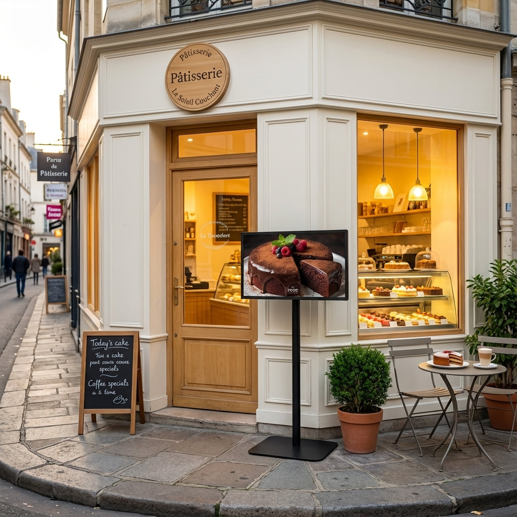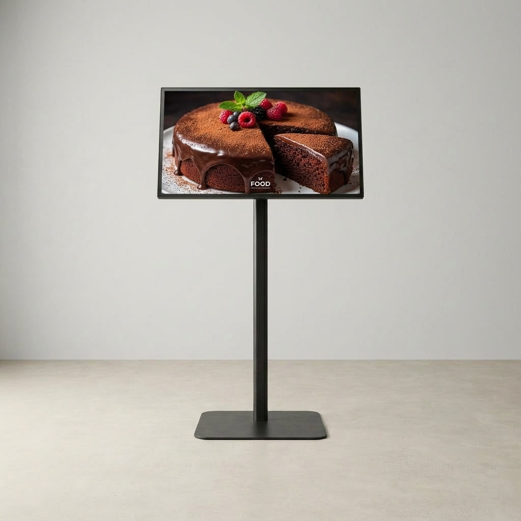 32インチサイズのデジタルサイネージディスプレイです。店舗の広告表示や施設案内、 イベント情報の掲示など幅広い用途に対応します。設置環境に応じて縦向き・横向きの どちらの表示方法にも対応しており、画面の角度調整も可能です。
