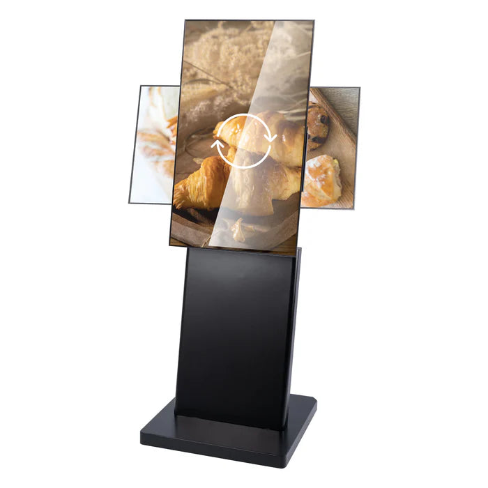 視認性と使いやすさを兼ね備えた傾斜型スタンド付きデジタルサイネージです。 画面角度の調整が可能で、設置環境に応じて最適な表示が可能。縦横の切替にも対応し、 店舗用ディスプレイや電子看板として幅広く活用できます。