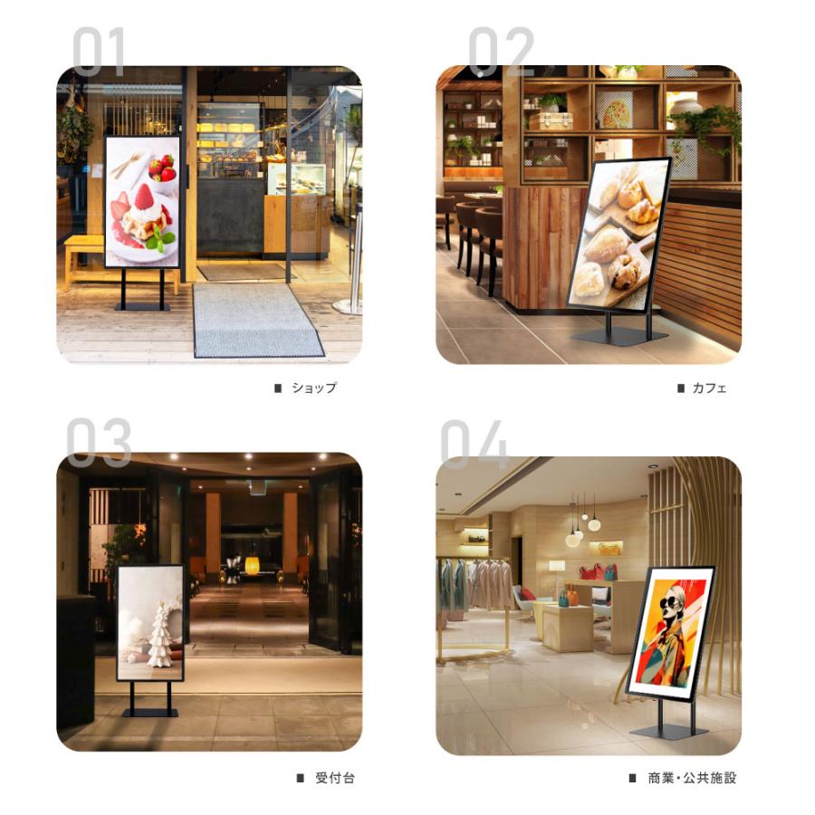 視線を集めやすい縦型(垂直型)スタンド設計のデジタルサイネージです。 縦表示により遠くからでも視認しやすく、店舗用ディスプレイや 電子看板として高い訴求力を発揮します。