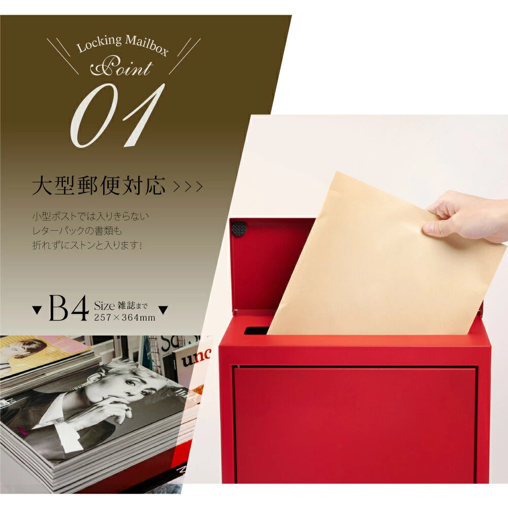 大型サイズ設計のメールボックスは、A4サイズの封筒や雑誌、レターパックなども余裕で収納できる大容量タイプ。 ダイヤル錠付きで防犯性にも優れており、屋外でも安心して使用できる郵便受けです。