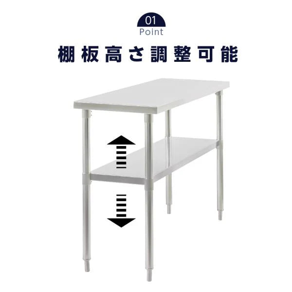 二段棚構造+アジャスト脚付きで、 設置環境に合わせた安定した設置が可能。 作業台上の空間を有効活用できる実用的な業務用モデルです。