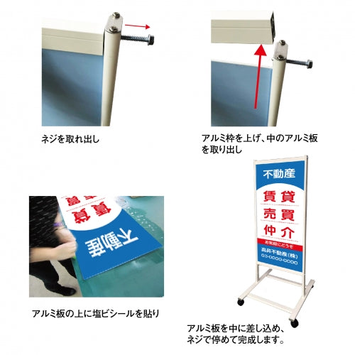 面板交換式によりポスターの差し替えが簡単で、販促内容の変更にも柔軟に対応。 軽量で扱いやすいアルミフレームを採用し、スタンド看板・両面看板として 飲食店・物販店・施設案内などにおすすめです。