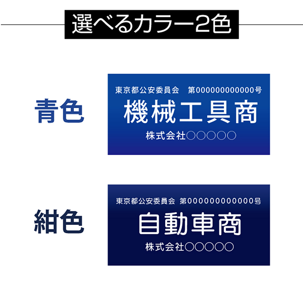 ご注文時、備考欄に製作情報を記載してください 1.公安委員会名 2.許可番号 3.商名 4.法人名(法人許可)・許可者氏名(個人許可) ※法人許可の場合は法人の正式名称、個人許可の場合は許可者の氏名を記載ください。屋号ではありませんので注意してください 【記入例】 1.[ 東京都公安委員会 ] 2.[ 第123456789012号 ] 3.[ 事務機器商 ] ※「美術品商」「衣類商」「時計・宝飾品商」「自動車商」「オートバイ商」「自転車商」「写真機商」「事務機器商」「機械工具商」「道具商」「皮革・ゴム製品商」「書籍商」「チケット商」 4.[ 株式会社●●●●● ] |