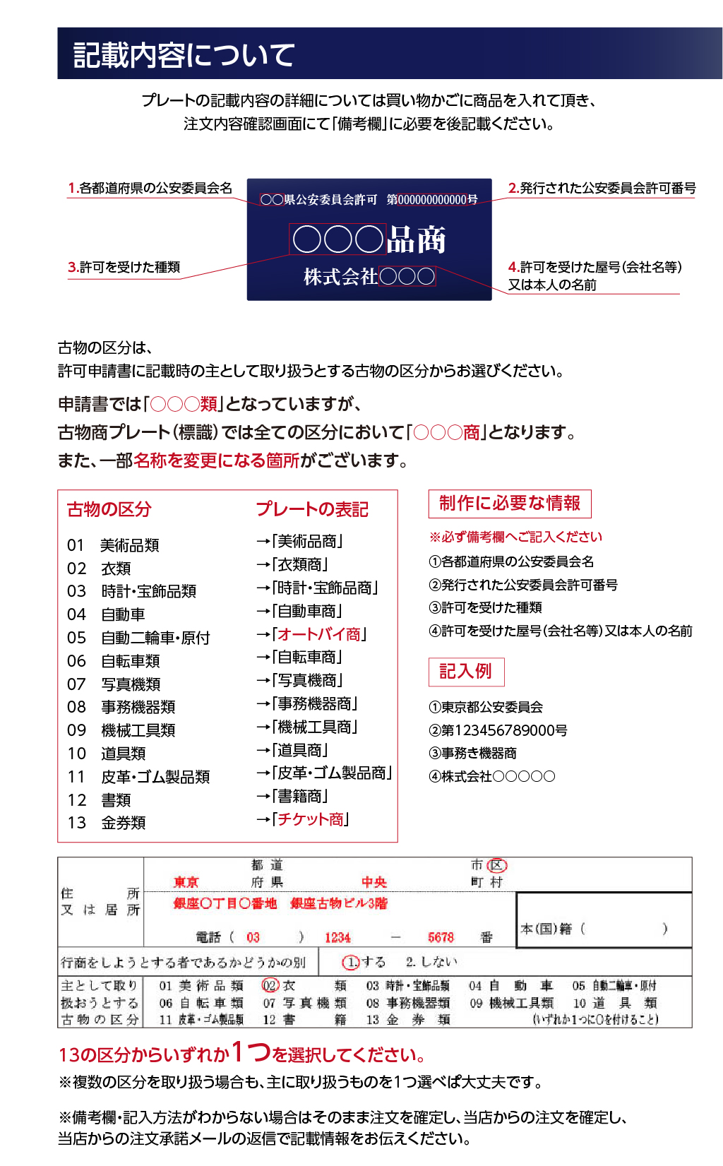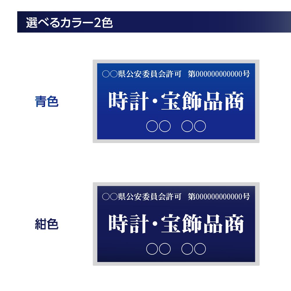 ご注文時、備考欄に製作情報を記載してください 1.公安委員会名 2.許可番号 3.商名 4.法人名(法人許可)・許可者氏名(個人許可) ※法人許可の場合は法人の正式名称、個人許可の場合は許可者の氏名を記載ください。屋号ではありませんので注意してください 【記入例】 1.[ 東京都公安委員会 ] 2.[ 第123456789012号 ] 3.[ 事務機器商 ] ※「美術品商」「衣類商」「時計・宝飾品商」「自動車商」「オートバイ商」「自転車商」「写真機商」「事務機器商」「機械工具商」「道具商」「皮革・ゴム製品商」「書籍商」「チケット商」 4.[ 株式会社●●●●● ] |