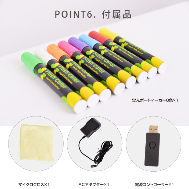 | 付属品 | マイクロクロス×1/蛍光ボードマーカー8色×1 ACアダプター×1/電源コントローラー×1 |