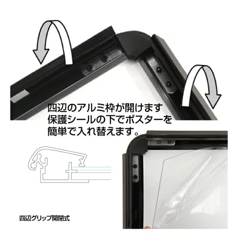 ポスターフレーム看板 B1サイズ W780mm×H1080mm 壁付グリップ式 黒シリーズ 屋外使用 簡単入れ替え 四辺開閉式 kpg-b1【法人名義:代引可】