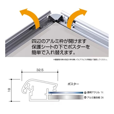 ポスターフレーム看板 W465mm×H640mm シルバー 屋外使用 壁付グリップ式 LEDパネル PGLED-A2【法人名義:代引可】