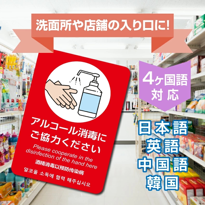 【メール便送料無料】2枚セット 注意喚起 4ヶ国語 アルコール消毒標識掲示 ステッカー 背面グレーのり付き 屋外対応 防水◎ 店舗標識や室内掲示にも!シールタイプ stk-c026-2set