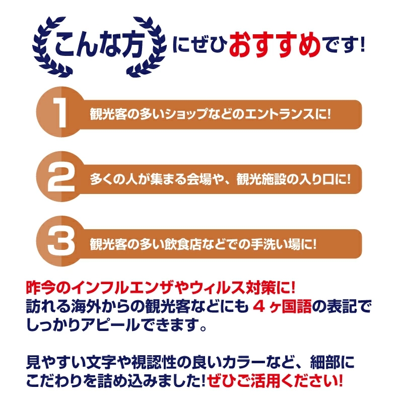 日本語、英語、中国語、韓国語の4か国語対応です。 ステッカー看板。シール状なので貼るだけでOK。