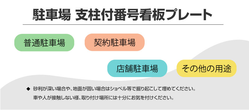 屋外対応 耐水性◎砂利や更地の駐車場に番号表示支柱を埋め込むことが可能な場所にご利用いただけます。
