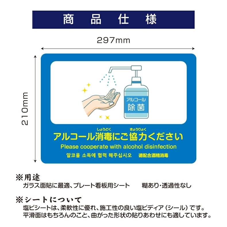 日本語、英語、中国語、韓国語の4か国語対応です。 ステッカー看板。シール状なので貼るだけでOK。