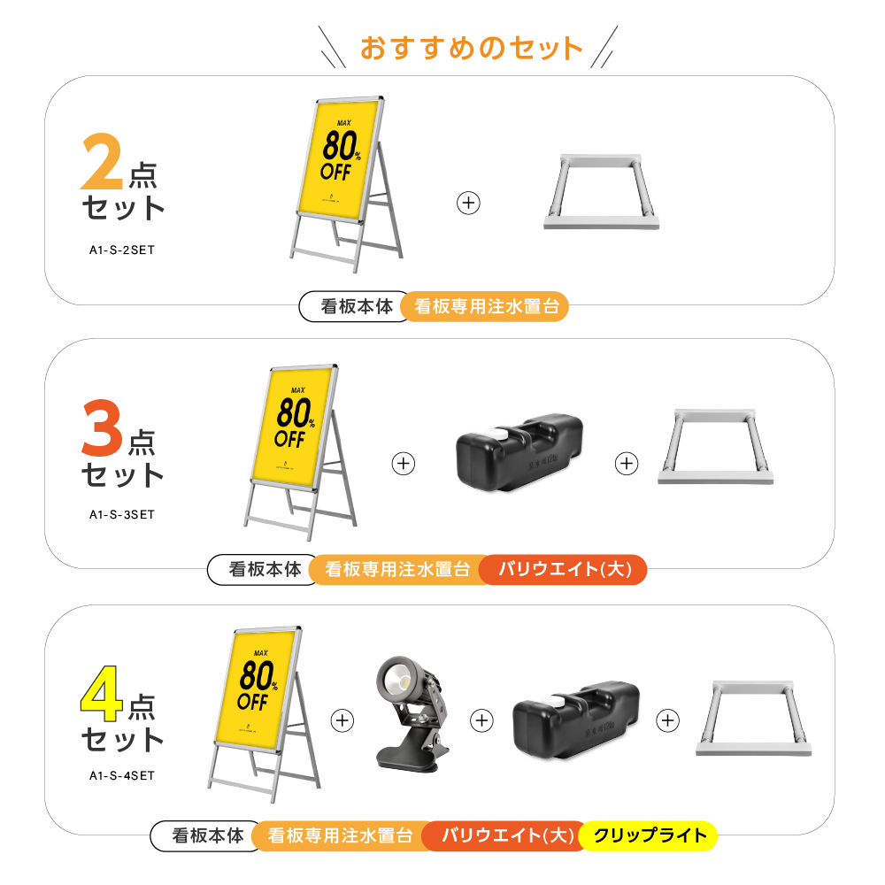 A型スタンド看板3点セット(A1サイズスタンド看板、バリウエイト、ウェイトアーム) クリップ式A型看板 片面 シルバー W640mm×H1225mm 屋外看板 スタンド看板 A看板 店舗用看板 クリップ式 前面開閉式3set-a1-s