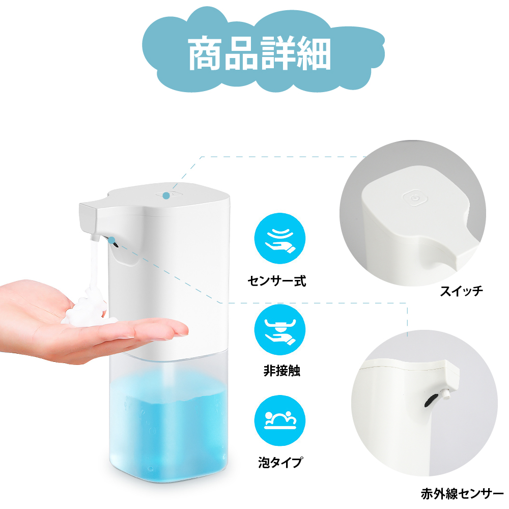 ソープディスペンサー 大容量400ml 自動 ソープディスペンサー自動誘導 オートセンサー IPX3防水 洗面所 キッチン 学校 泡 自動 液体 防水 卓上 両用 非接触 細菌抑制 adsq-400