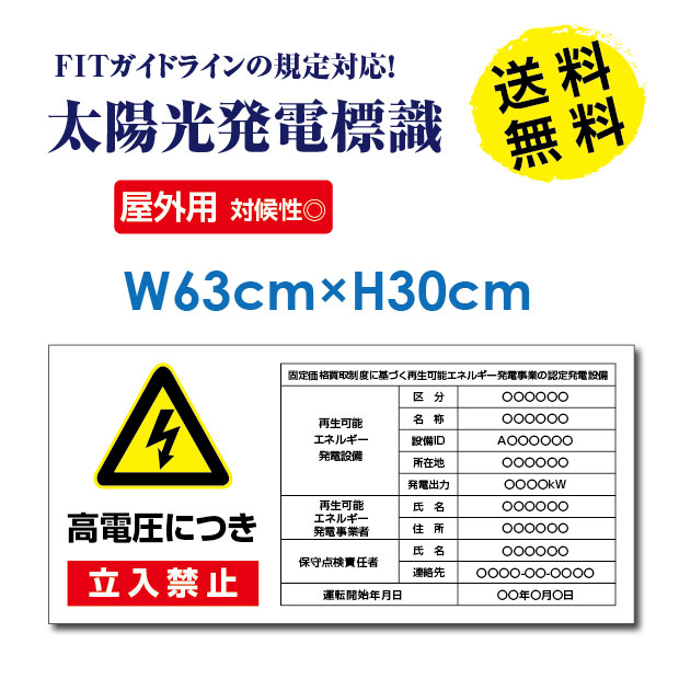 ■送料無料 太陽光発電標識 内容印刷込み 再生可能エネルギーの固定価格買取制度(FIT)対応 高電圧危険 立入禁止看板 H63×W30cm /表示 太陽光発電 設備用 再生可能エネルギー /掲示板 Sun-Hikari-a2