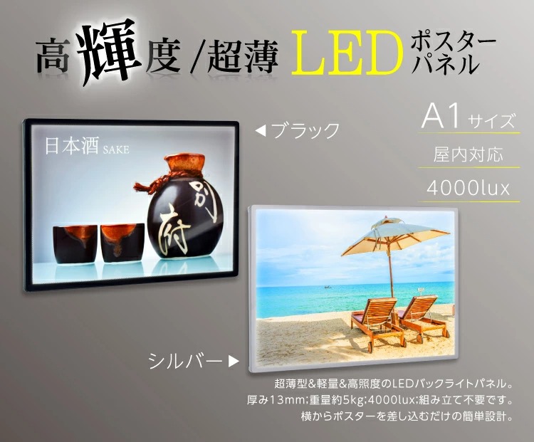 LEDポスターパネル 【ブラック、シルバー】2色選べる A1 薄型 ライトパネル ライティングボード led-pu-a1