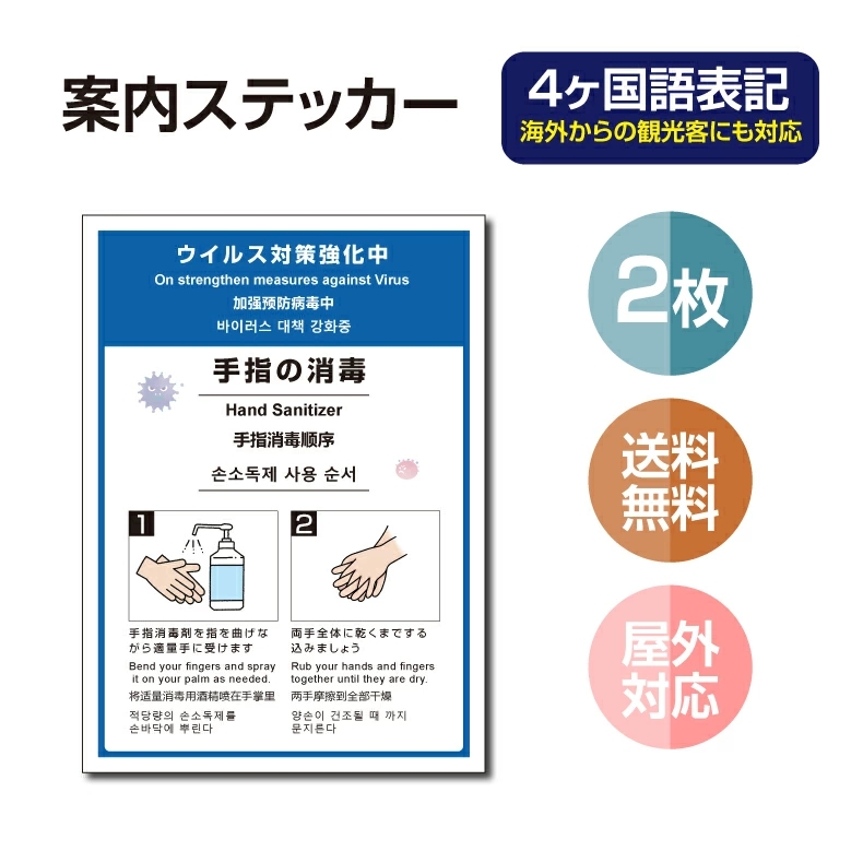 【メール便送料無料】2枚セット 注意喚起 4ヶ国語 アルコール消毒標識掲示 ステッカー 背面グレーのり付き 屋外対応 防水◎ 店舗標識や室内掲示にも!シールタイプ stk-c029-2set