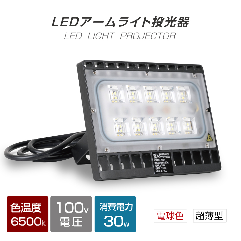 LED 投光器 電球色 6500K 30W 100v電圧 IP65 防水 防塵 ledライト 屋外 工場 ガレージ 駐車場 街灯 看板 集魚灯 作業灯 防犯 防災 舞台照明 照明 ポータブル投光器 ACコード付 省エネ 送料無料 stledbk30-6500