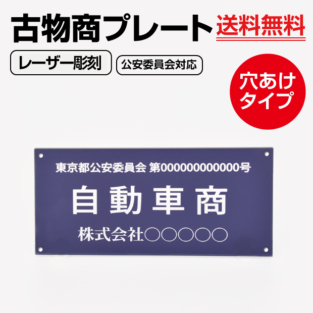 送料無料 メール便対応 古物商プレート168×88mm (紺色)(壁掛け用穴ありタイプ)/警察 公安委員会指定 古物商許可証 格安 標識 s-curio-navy-hole